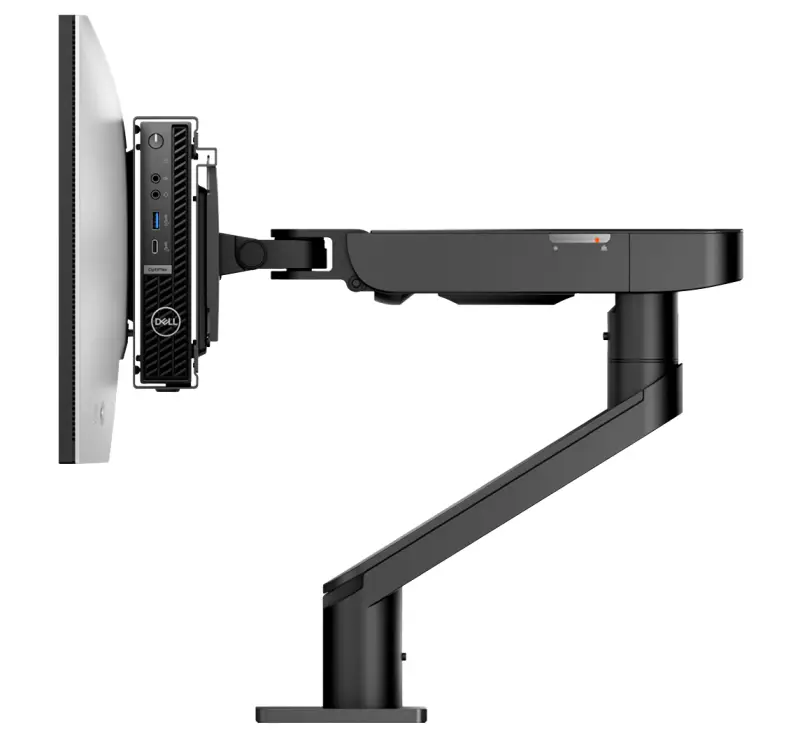公式販売サイトからカスタマイズ、追加オプションで購入できる「Dell デュアル VESA マウント – Micro/シン クライアント」と「VESA対応のモニターアーム」を使えば、👇のようにモニターとモニターアームの間に設置可能です。